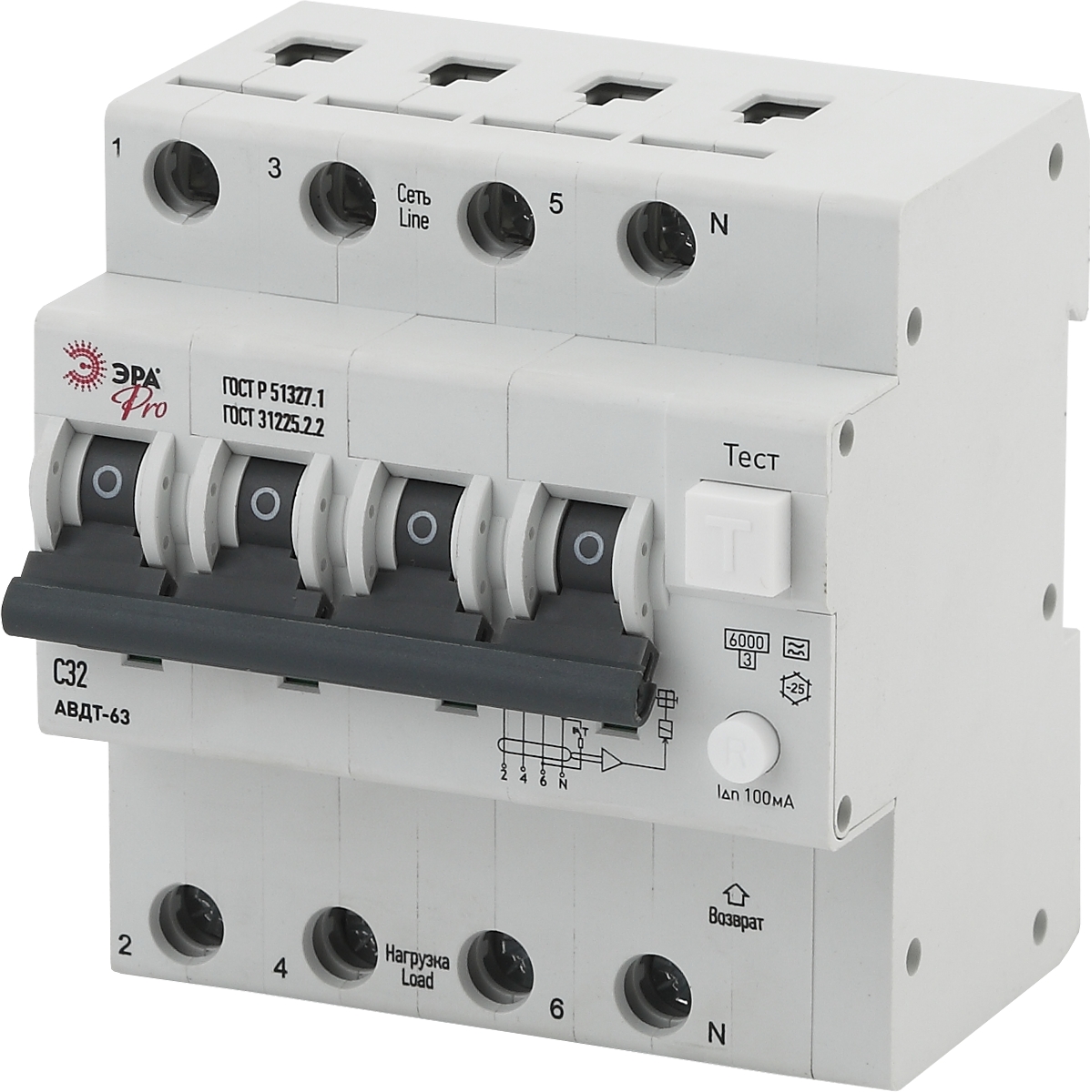 Дифференциальный автомат (АВДТ) 4-полюсный (3P+N) 32А 100мА характеристика C A _ ЭРА