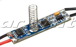 Диммер с подсветкой, встраиваемый в профиль, реагирует на прикосновение к экрану, короткое нажатие - вкл/выкл, длинное нажатие - диммирование. Для профилей с внутренней высотой (пов. профиля - пов. экрана) от 12 до 20 мм. 12-24V, 3A. Размер 42x10x21mm