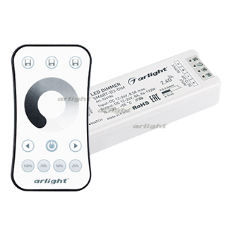 Комплект диммера с пультом для одноцветной светодиодной ленты (ШИМ). Питание/рабочее напряжение 12-24VDC, максимальный ток 8A на канал, 1 канал, максимальная мощность 96-192W. Функция Push-Dim. Габариты диммера 97x33x18 мм, габариты пульта 107x58.5x9 мм.