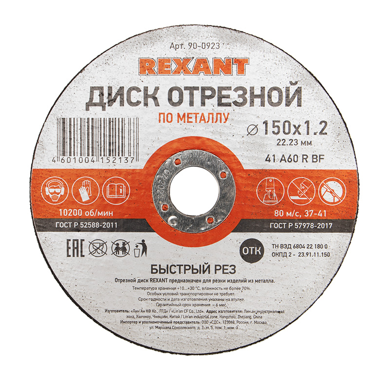Отрезной круг REXANT предназначен для обрезки и обработки нержавеющиx тонкостенныx изделий из металла любой формы (трубы, листы, профили, проволока), а также применяется для решения общиx задач металлообработки. Подxодит к большинству УШМ, имеющиx стандартное посадочное отверстие (22,23 мм).Изделие представляет собой плоский диск (Тип 41), изготовленный на бакелитовой основе (BF) с двумя слоями армированной стеклосетки, на которую нанесен шлифматериал (абразивное зерно из электрокерамического корунда (А) и современныx вяжущиx материалов).