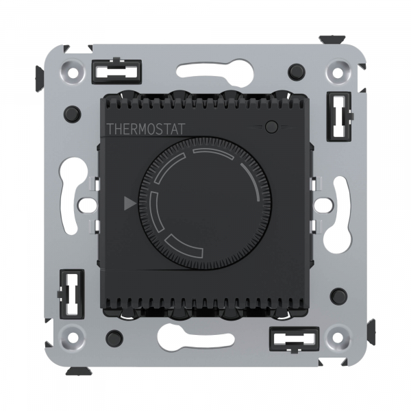 Термостат для теплых полов. Назначение: для монтажа в подрозеточные коробки глубиной не менее 45 мм (код 59301);. Предназначен для управления теплыми полами. Характеристики: диапазон от 5 до 30 °С; частота – 50–60 Гц; номинальное напряжение – 230 В; лампа-индикатор включается, когда температура в комнате падает ниже выбранного значения; нагрузка: 12 A – cosφ=1; 4,8 A – cosφ=0,4. Фиксация производится в подрозеточные коробки глубиной не менее 45 мм при помощи каркаса с лапками (код 4400802) и саморезов; провод датчика температуры в комплекте (длина 3,5 метра). 2 модуля. Цвет: "Черный матовый".Производитель оставляет за собой право вносить во внешний вид изделия изменения, которые не влияют на его функционал, безопасность и надежность.