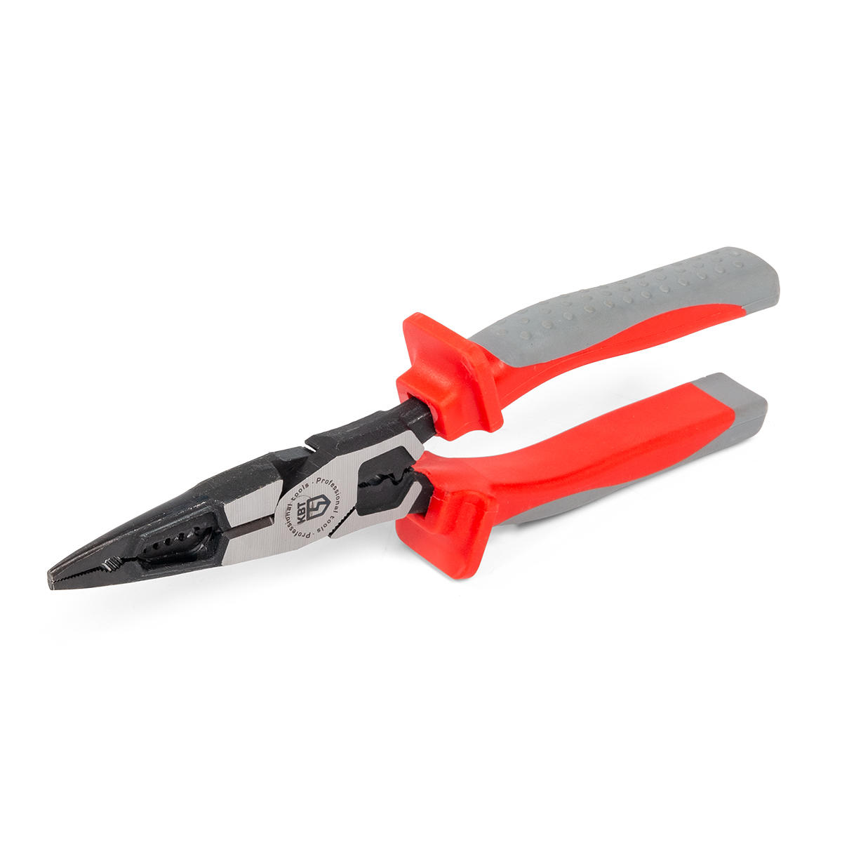 Для работы под напряжением до 1000 В.Функции инструмента:захват плоских и круглых деталей.зачистка проводов сечением 0.52.5 мм.резка проводов диаметром до 8 мм.опрессовка наконечников..Режущие кромки дополнительно закалены токами высокой частоты. HRC 62.Материал рабочей части: хром-ванадиевая сталь.Обработка поверхности: матовое никелирование.Двухцветные многокомпонентные рукоятки с упорами для защиты от соскальзывания.Вес: 220 г.Длина: 200 мм.