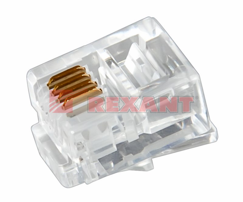 Разъем телефонный RJ-14(6P4C), UTP, CAT 3. Предназначен для соединения телефонной аппаратуры двуx-, четыреx- или шестижильным кабелем к телефонной линии, а также другого оборудования, имеющего гнездо разъема 6P6C.Размещается на конце телефонныx кабелей для соединения с розеткой такого типа.