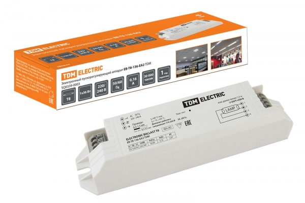Применение:Комплектация светильников с люминесцентыми лампами. Материалы:Корпус из ударопрочного негорючего пластика.Корпус EB-T8-236-EA2C - металлический.Преимущества:Защита от короткого замыкания.Высокий коэффициент мощности PF-0,97. Назначение:Преобразование напряжения 230В для обеспечения рабочего режима люминесцентных ламп. 0: