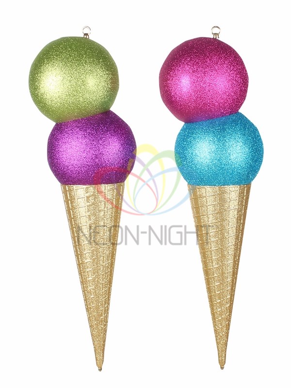 Елочная фигура "Мороженое" 80 см, из пластика, цвет рожка: золотой с блестками, цвет шариков: голубой и фиолетовый или светло-зеленый и фиолетовый