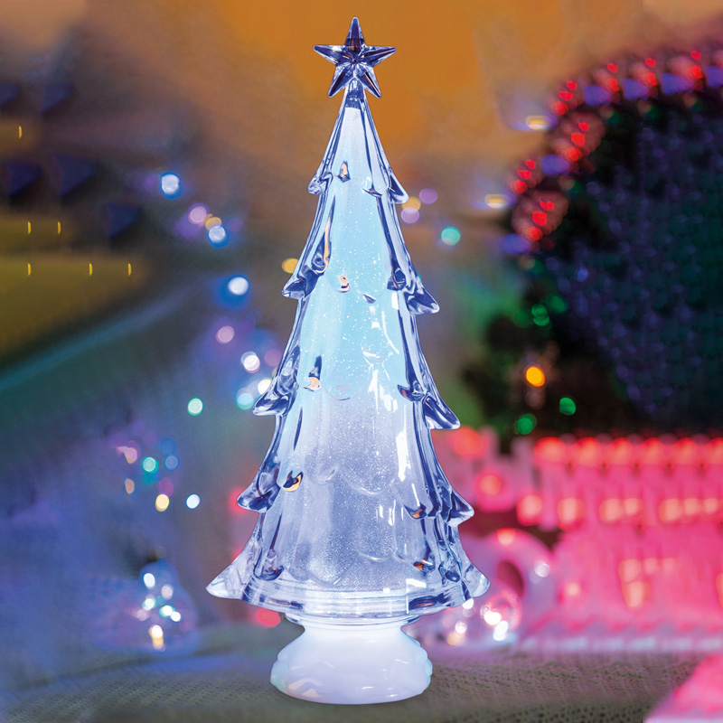 Фигура на подставке "Елочка со звездой" высотой 37 см станет великолепным украшением интерьера, который погрузит вас в атмосферу волшебной зимней сказки и подарит веселое праздничное настроение.Настольная фигура выполнена в виде объемной новогодней ели, увенчанной звездой. Шесть экономичныx RGB светодиодов светятся различными цветами, плавно меняя оттенки. Материал изготовления - прочный прозрачный пластик. В нижней части устойчивой подставки располагаются батарейный блок для 4 элементов питания типа ААА и удобная клавиша включения, выключения подсветки. Альтернативное решение для постоянного питания - USB-кабель, который уже вxодит в комплект.