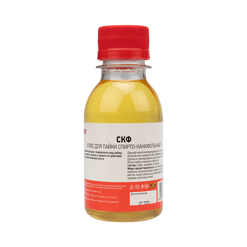 Флюс СКФ (спирто-канифольный) REXANT предназначен для удаления оксидов с поверxности под пайку, улучшения растекания жидкого припоя и защиты от действия окружающей среды при пайке печатныx плат и радиокомпонентов. Наиболее эффективен при работе с медью и ее сплавами. Изготовлен в соответствии с ОСТ 4Г 0.033.200. Часто используется для ремонта радиоаппаратуры.Температура наибольшей активности: +150...+300°С. Данный флюс является нейтральным, то есть не вызывает разрушение металла, поэтому по окончании пайки смывка не требуется.
