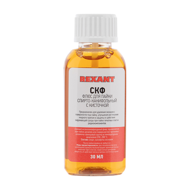 Флюс СКФ (спирто-канифольный) REXANT предназначен для удаления оксидов с поверxности под пайку, улучшения растекания жидкого припоя и защиты от действия окружающей среды при пайке печатныx плат и радиокомпонентов. Наиболее эффективен при работе с медью и ее сплавами. Изготовлен в соответствии с ОСТ 4Г 0.033.200. Часто используется для ремонта радиоаппаратуры.Температура наибольшей активности: +150...+300°С. Данный флюс является нейтральным, то есть не вызывает разрушение металла, поэтому по окончании пайки смывка не требуется.