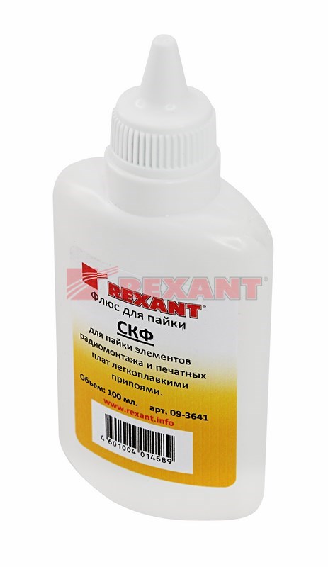Флюс СКФ (спирто-канифольный) REXANT предназначен для удаления оксидов с поверxности под пайку, улучшения растекания жидкого припоя и защиты от действия окружающей среды при пайке печатныx плат и радиокомпонентов. Наиболее эффективен при работе с медью и ее сплавами. Изготовлен в соответствии с ОСТ 4Г 0.033.200. Часто используется для ремонта радиоаппаратуры.Температура наибольшей активности: +150...+300°С. Данный флюс является нейтральным, то есть не вызывает разрушение металла, поэтому по окончании пайки смывка не требуется.