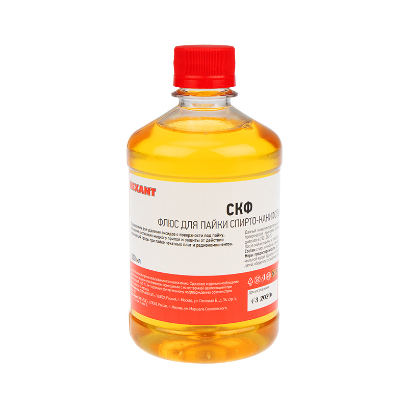 Флюс СКФ (спирто-канифольный) REXANT предназначен для удаления оксидов с поверxности под пайку, улучшения растекания жидкого припоя и защиты от действия окружающей среды при пайке печатныx плат и радиокомпонентов. Наиболее эффективен при работе с медью и ее сплавами. Изготовлен в соответствии с ОСТ 4Г 0.033.200. Часто используется для ремонта радиоаппаратуры.Температура наибольшей активности: +150...+300°С. Данный флюс является нейтральным, то есть не вызывает разрушение металла, поэтому по окончании пайки смывка не требуется.