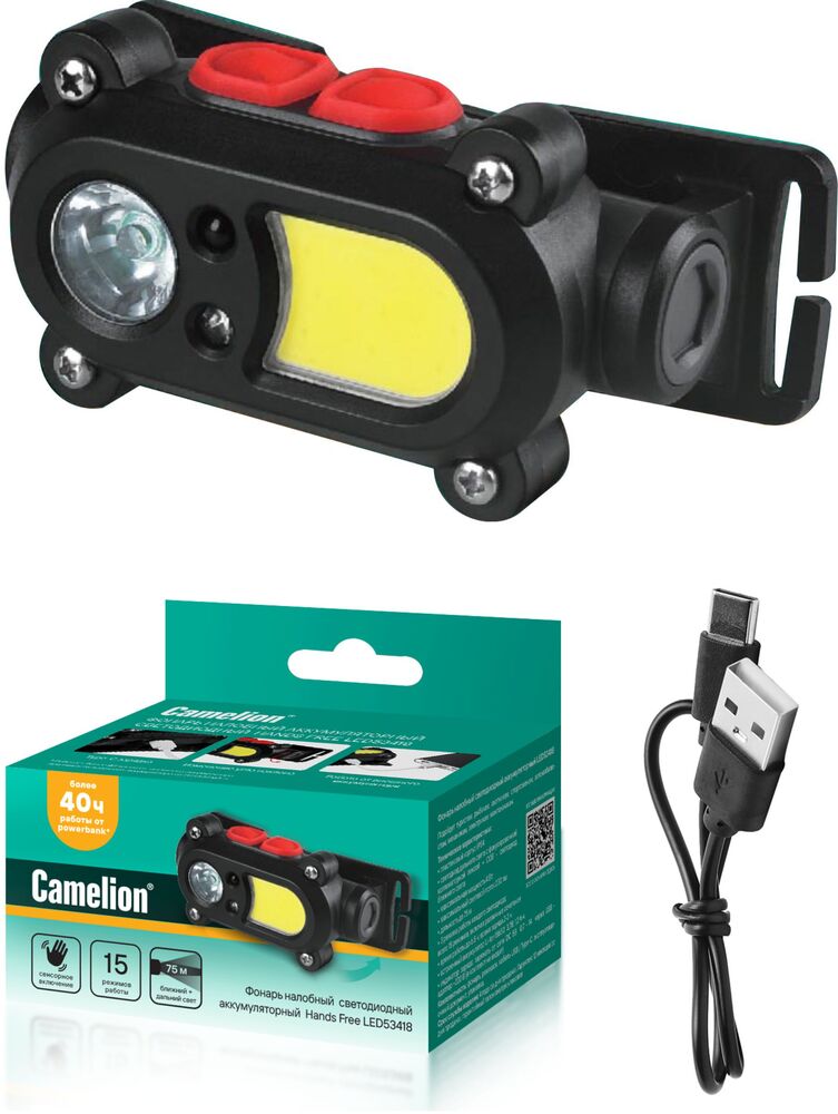 Фонарь LED(фонарь налоб. акк. 3,7В, карбон, 2 LED,3 Ватт, 15 реж., сенсор, Micro-USB) Camelion 53418