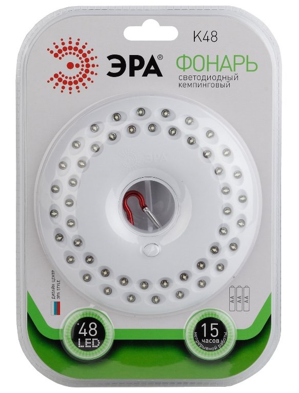 Фонарь собственного дизайна ЭРА, ставший одной из самых популярных туристических моделей. Производится в России. Получил название "НЛО" за круглую форму корпуса и футуристический внешний вид. 48 светодиодов эргономично расположены на корпусе по кругу, они не перегорают, не требуют замены, разумно расходуют заряд и дают яркое освещение. Особое преимущество и настоящая "фишка" ЭРА НЛО-48 - в секретах эксплуатации. Фонарь закрепляется при помощи специального кронштейна (подвес + карабин), превращаясь в яркую походную "люстру". Для металлических поверхностей в тыльную сторону корпуса вмонтированы магниты. Но самый простой способ использования - закрепить на горлышке бутылки. Тогда это уже импровизированный настольный светильник. Надёжный помощник в походе, на охоте, рыбалке, загородном отдыхе. Набирают популярность и нестандартные способы применения ЭРА НЛО-48 - его используют как бюджетный вариант кольцевой подсветки при портретных фотосъёмках. Корпус ЭРА НЛО-48 стал отражением современных bio-тенденций