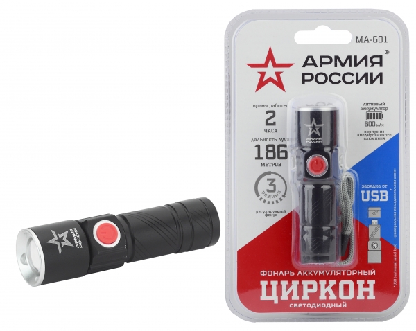 ЭРА Армия России Циркон - аккумуляторный светодиодный фонарь в высокопрочном корпусе из анодированного алюминия. Заряжается от USB, оснащён фокусировкой нового поколения - от ближнего заливающего света до направленного луча повышенной дальности (186 метров). По сути это 3 фонаря в одном компактном гаджете. Стильный лаконичный дизайн с фирменной звездой "Армия России". ЭРА Циркон не боится коррозии, долговечен и прост в уходе.Анодированное покрытие сохраняет фонарь в идеальном состоянии после долгих лет использования. Литиевый аккумулятор мощностью 600 мАч обеспечивает оптимальную ёмкость для универсального карманного источника света. Этот компактный фонарь удобно использовать в быту, брать с собой в путешествия, хранить в автомобиле. Красивая брендированная блистерная упаковка делает ЭРА Циркон отличным подарком мужчине любого возраста и социального положения. А история названия - дополнительный повод полюбить этот гаджет. Циркон - российская гиперзвуковая противокорабельная крылатая ракета с уникальной скоростью и дальностью полёта. Серия фонарей ЭРА Армия России - совместный проект отечественного бренда ЭРА и АО "Военторг", действующего на основании лицензии Министерства обороны РФ.