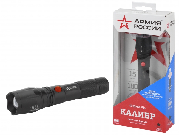 ЭРА Армия России Калибр - универсальный светодиодный аккумуляторный фонарь с лучом повышенной дальности, пятикратным зумом и встроенным светонакопителем. Его легко найти в тёмном помещении или в траве - после выключения сохраняет лёгкое свечение.Серия фонарей ЭРА Армия России - совместный проект отечественного бренда ЭРА и АО "Военторг", действующего на основании лицензии Министерства обороны РФ. ЭРА Армия России Калибр оснащён ёмким литиевым аккумулятором (2100 мАч), одного заряда которого хватает на 7 часов непрерывной работы. Зарядное устройство в комплекте. Светодиодный луч повышенной дальности имеет возможность фокусировки. Пять режимов, удобных пользователю - от ближнего заливающего света (для того, чтобы хорошенько осмотреться вокруг в темноте) до длинного направленного луча (чтобы определиться с дальнейшим направлением пути). ЭРА Армия России Калибр выглядит отлично. Благодаря необычному фактурному дизайну корпуса и тщательной сборке его приятно держать в руках, а за счёт продуманного функционала им приятно пользоваться. Фонарь украшает фирменная звезда Армии России - знак качества и особого статуса бренда. Аккуратная красная кнопка включения - дополнительный дизайнерский бонус.