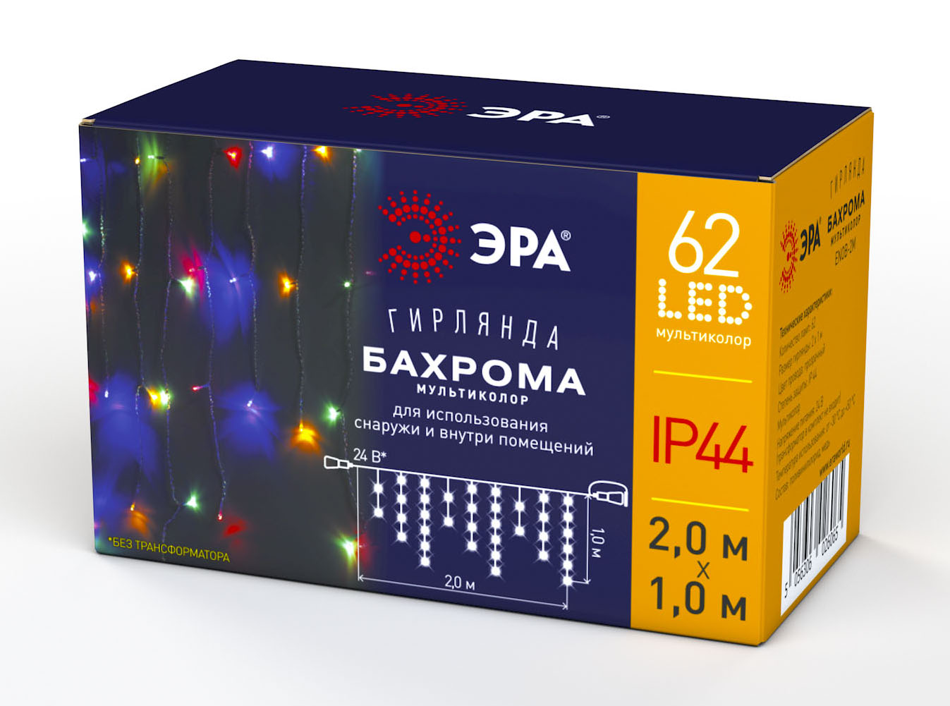 Разноцветная праздничная гирлянда ЭРА "Бахрома" (арт. Б0041906) со светодиодными лампочками на проводах разной длины. Создаёт многоуровневую нарядную подсветку, является идеальным решением для украшения окон, новогоднего оформления помещений. Защищена от влаги и пыли, морозостойка, поэтому с успехом может применяться на улице. Полупрозрачный повод практически не заметен - гирлянда будет хорошо смотреться в интерьере любого стиля. Длина гирлянды - 2 метра, максимальная длина отдельной нити - 1 метр. Каждая нить светится своим цветом - красный, зелёный, жёлтый или синий. LED-элементы формируют насыщенные яркие оттенки. Ровное приятное для глаз свечение создают 62 светодиода последнего поколения. Они не перегреваются даже при непрерывной многочасовой работе гирлянды и не тускнеют со временем. ЭРА "Бахрома" прослужит много лет, будет радовать в любой праздник. Современная светодиодная технология экономит до 90% электроэнергии. Гирлянда отвечает требованиям пожарной безопасности, работает от трансформатора. Трансформатор ЭРА, преобразующий входное напряжение 210-240 В в выходное 24 В: