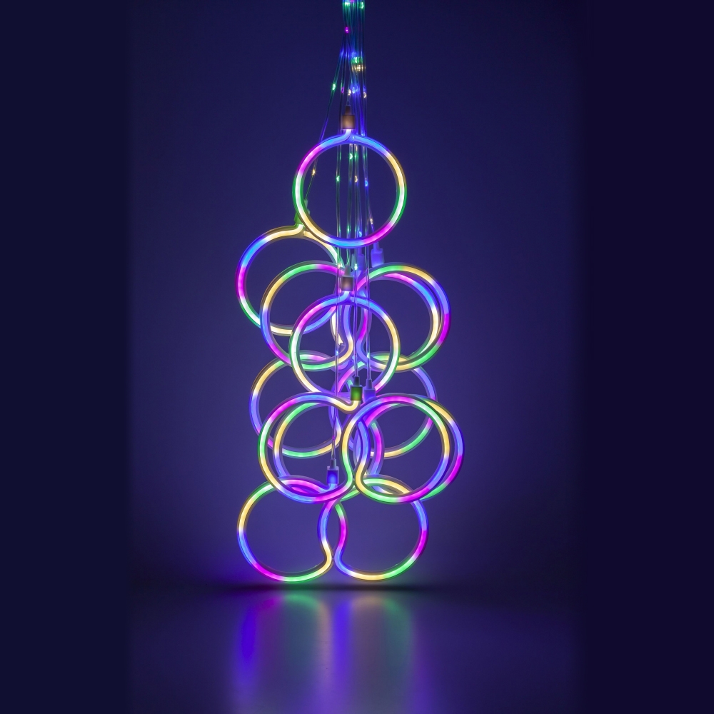 Новогодняя гирлянда светодиодная ЭРА "Неоновые кольца" 2.4х0.65 м EGNIG-RI (арт. Б0051878) создаст дома неповторимую атмосферу к Новому году и Рождеству. Гирлянда штора особенно красиво будет смотреться на окне. Данная модель состоит из 520 светодиодов с разноцветным светом (мультиколор), фигурки выполнены в форме одинарных и двойных колец. Электрогирлянда дождик имеет незаметные полупрозрачные провода, длина кабеля составляет 1.5 метра, класс защиты IP20 (использование внутри помещений), питание 220 В. Гирлянда LED ЭРА прослужит долгие годы, станет универсальным украшением гостиной, кухни, спальни или другого пространства, а еще это отличный подарок для Ваших любимых. Новогодний декор для дома всегда вдохновляет и дарит настроение праздника.