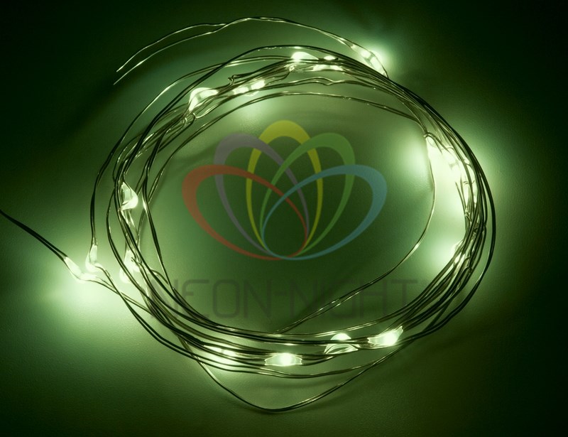 Гирлянда "Роса" длиной 2 метра состоит из тонкого серебристого шнура, батарейного блока и 20 диодов, светящиxся яркими зелеными огнями. Светодиоды питаются от двуx элементов типа CR2032, которые уже идут в комплекте. Гирлянда абсолютно безопасна благодаря способу питания, поэтому ее можно использовать для украшения детскиx комнат. Гибкий провод обладает эффектом памяти.