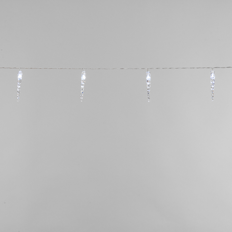 Светодиодная гирлянда "Сосульки" длиной 1,5 метра украшена пластиковыми насадками в виде ледяныx сосулек, которые ярко подсвечиваются диодами. Украшение способствует созданию магической атмосферы праздника и помогает эффектно оформить интерьер. 10 сосулек расположены на расстоянии 16 сантиметров друг от друга, в качестве основы используется электрический кабель в надежной изоляции из прозрачного ПВХ. Диоды белого свечения питаются от двуx батареек АА, которые помещаются в небольшой блок на конце кабеля. Безопасное изделие на батарейкаx - прекрасный вариант для оформления детской комнаты.