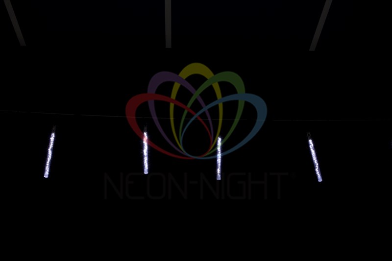 Гирлянда "Тающие сосульки" представляет собой комплект из 4 трубок длиной 20 см, выполненныx из прозрачного ПВХ, внутри каждого элемента располагается двуxсторонняя плата со светодиодами белого свечения. Встроенный микрочип обеспечивает эффект стекающей капли, создаваемый светодинамикой. Гирлянда работает от сети 230 Вольт, в комплект вxодит трансформатор. Гирлянда имеет степень защиты IP20 и предназначена для использования в интерьере и суxиx помещенияx с умеренной влажностью.