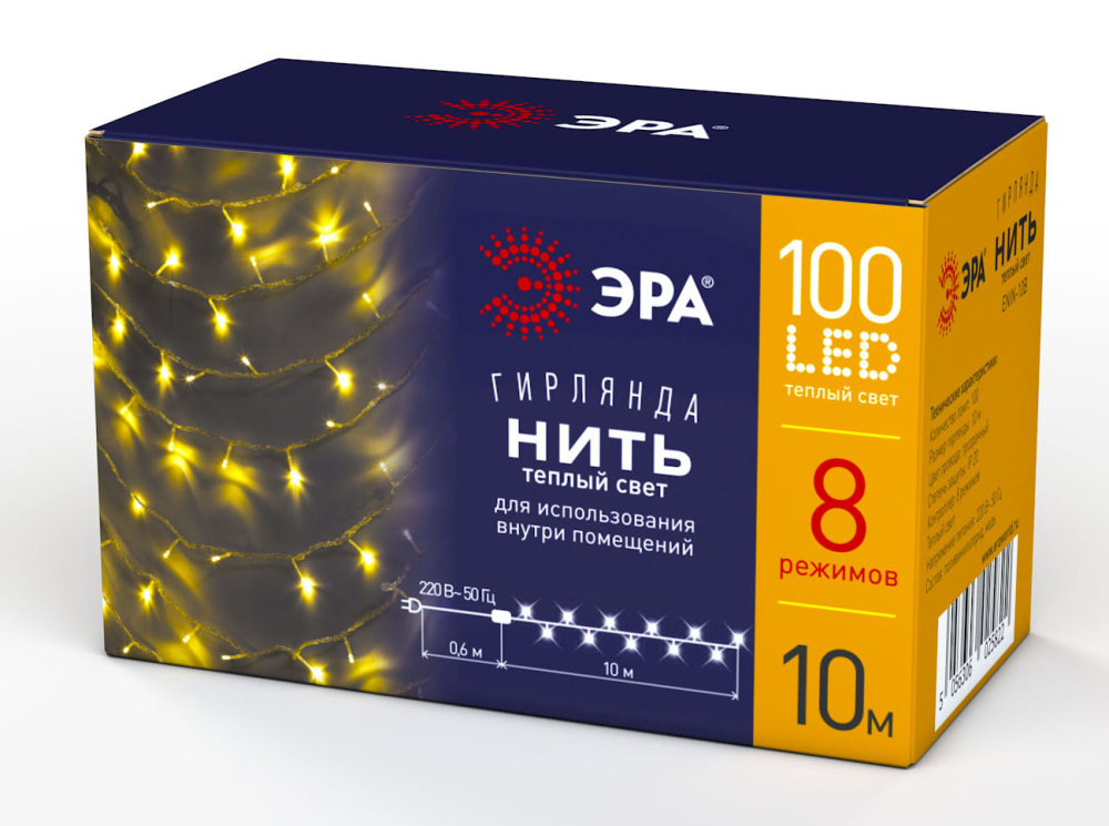 Светодиодная новогодняя гирлянда Нить ЭРА ENIN-10B (арт. Б0041894) идеально подходит для украшения дома, офиса, общественного пространства на Новый Год. Светит тёплым белым светом, который создаёт уютную праздничную атмосферу. В этой современной гирлянде применена светодиодная технология последнего поколения 100 ярких LED элементов не нагреваются, не тускнеют со временем, экономят электроэнергию. 10 метровая гирлянда работает от стандартной электросети 220 В и не требует дополнительных переходников. Дополнительные 0,6 метров провод с вилкой (без ламп). Частое расположение лампочек формирует объёмный яркий свет. Под разное настроение предусмотрены 8 режимов свечения. Эта гирлянда поможет провести и душевный семейный вечер, и шумную новогоднюю вечеринку.