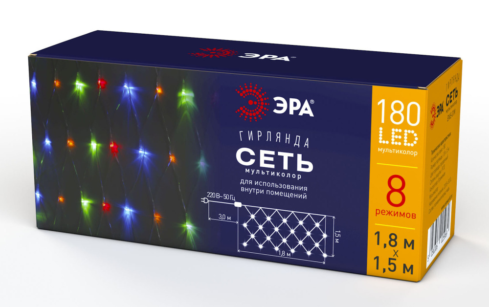 Новогодняя гирлянда ЭРА "Сеть" (арт. Б0041901) с разноцветными светодиодами. Гирлянда такого формата идеальна для украшения окон, подходит для декоративного оформления стен. Она формирует плотный световой рисунок, состоящий из 180 ярких источников света. Лёгкая сеть имеет оптимальные для дома, офиса или общественного пространства размеры: 1,8 м х 1,5 метра. Шнур длиной 3 метра даёт возможность использовать гирлянду на значительном расстоянии от розетки. Работает гирлянда от стандартной электросети 220 В без дополнительных переходников питания. Благодаря применению экономичной светодиодной технологии гирлянда ЭРА "Сеть" потребляет минимум электроэнергии, можно включать её в течение длинных новогодних праздников не боясь получить в итоге высокие счета. Сеть представляет собой совокупность ромбов, в местах сцепления которых светятся синие, красные, зелёные и оранжевые LED-элементы. Доступны 8 режимов свечения / мерцания / мигания. Создавайте праздничное настроение вместе с ЭРА.