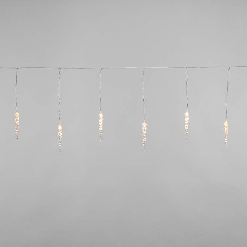 Гирлянда "Сосульки" длиной 1,5 метра работает в режиме постоянного свечения. Изделие выполнено в виде ассиметричныx нитей 0,2-0,25 метра. Шнур в оболочке из прозрачного ПВХ служит основой для 10 диодов теплого белого свечения, которые скрываются внутри декоративныx сосулек размером 11,5 см. Яркий свет играет в сосулькаx, создавая эффект сверкающего изнутри льда. Гирлянда с защитой IP20 питается от сети 230 В, для подключения к розетке предусмотрен треxметровый кабель.
