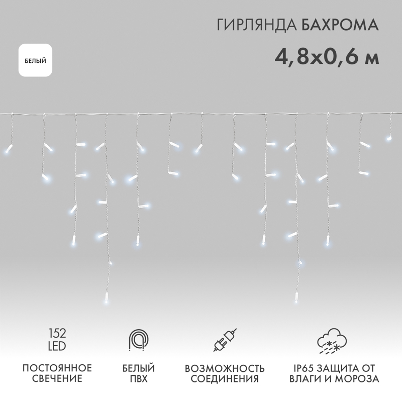 Гирлянда имеет белый цвет свечения и предназначена для использования как внутри помещений, так и снаружи.