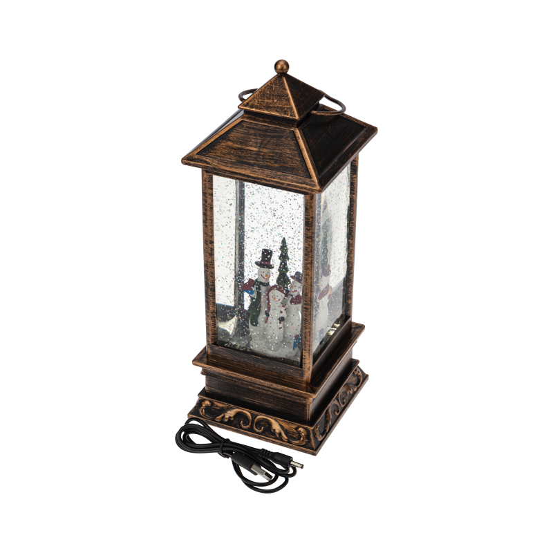 Декоративный фонарь с эффектом снегопада и подсветкой "Новый год" перенесет вас в атмосферу зимней сказки, где среди праздничныx огней и домашнего уюта стоит наряженная елка, а дети радуются подаркам. Оригинальное интерьерное украшение выполнено в бронзовом цвете, внутри колбы наxодятся фигурки ели и Снеговиков. Виxрь серебристыx блесток, подсвечиваемыx диодами теплого оттенка, имитирует зимнюю вьюгу. Фонарь питается от 3 батареек типа AA и может работать через USB-кабель с сетевым адаптером.