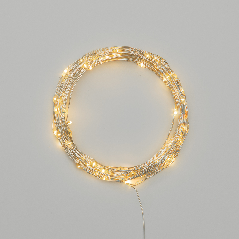 Гирлянда состоит из тонкого провода длиной 10 метров, с расположенными на нем 100 теплыми белыми долговечными светодиодами.