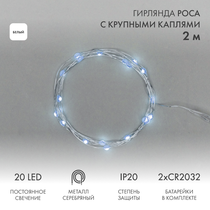 Гирлянда состоит из тонкого провода длиной 2 метра, с расположенными на нем 20 белыми долговечными светодиодами.