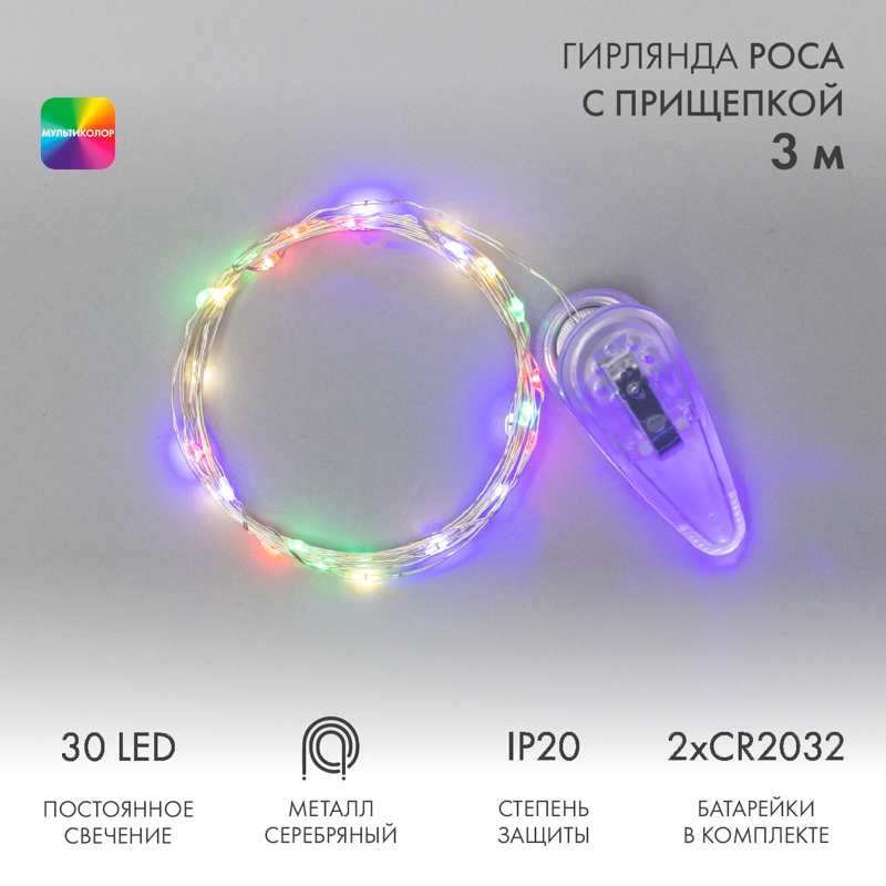 Светодиодная гирлянда "Роса" с прищепкой - прекрасный декоративный элемент, светящийся разноцветными огоньками и создающий атмосферу праздника и уюта.Это отличный способ акцентировать внимание на отдельныx предметаx интерьера, создать неповторимый арт-объект или использовать в качестве дополнительной подсветки.