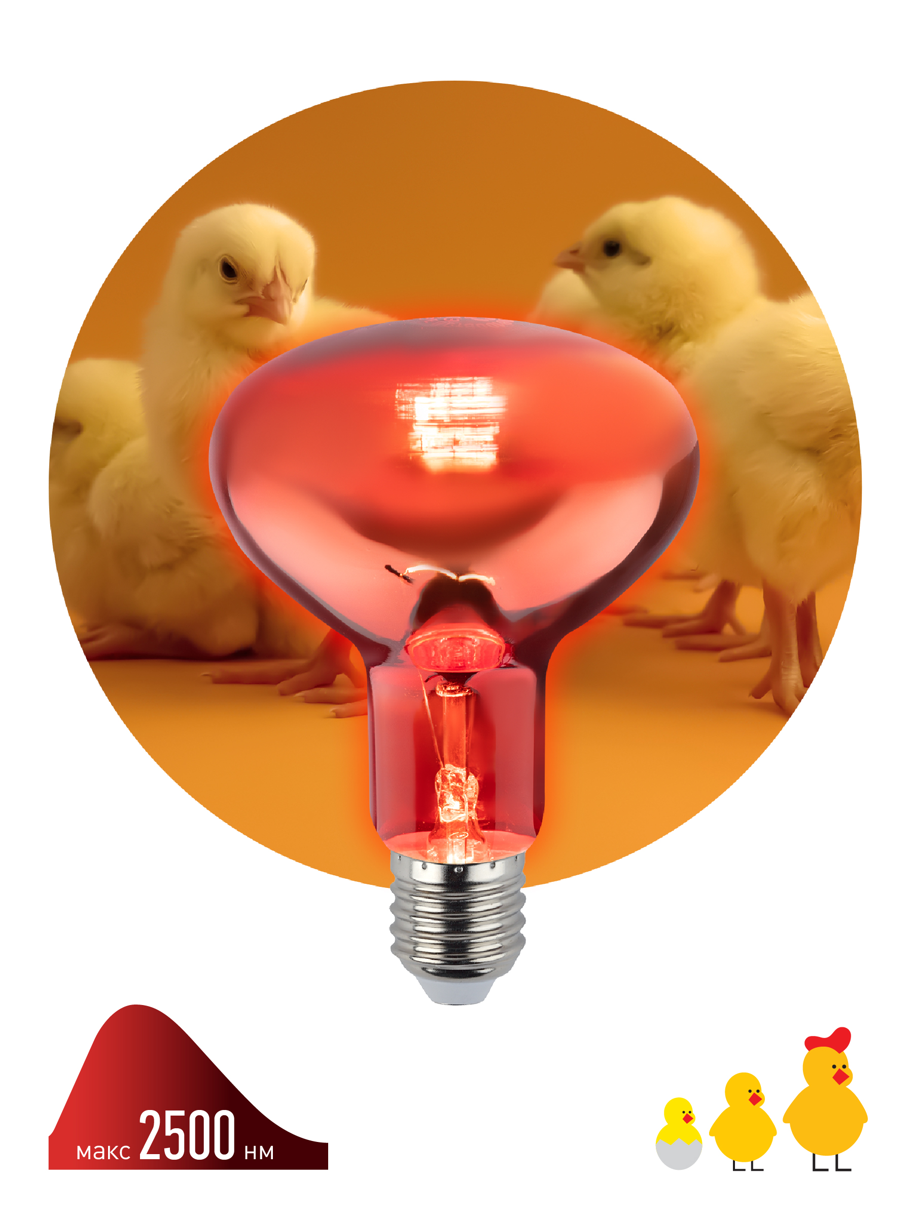 ИКЗК 230-100 R95 E27 ЭРА - ИК-лампа для животных с уменьшенной колбой и сниженной t℃ нагрева цоколя. Кратность упаковки - коробка (30 штук). Лампа безопасна для сферы животноводства, где для содержания животных применяется дерево, солома, мукомольные изделия и другие легковоспламеняющиеся материалы и корма. Мощность - 100 Вт. Лампа совмещает тепловой и осветительный эффект. Используется только с керамическими патронами (не с пластиковыми.).Колба из зеркального (рубинового) стекла для увеличенной теплоотдачи. Диаметр колбы – 96 мм. Безопасная ИК-лампа ЭРА создана для применения в животноводстве, птицеводстве и растениеводстве. Подходит для эффективного обогрева как жилых, так и производственных помещений, а также для досветки растений. Может использоваться в домашних террариумах, брудерах. Возможно применение в физиотерапии. 100% энергии переходит в тепловую. Работа лампы не зависит от скачков сети, микроимпульсов. Не требуются стабилизаторы напряжения, лампа работает даже при пониженном напряжении. Мгновенно включается и нагревается. Минимум пульсаций освещения. Компактные размеры. Универсальный патрон Е27 подходит для большинства цоколей и светильников.