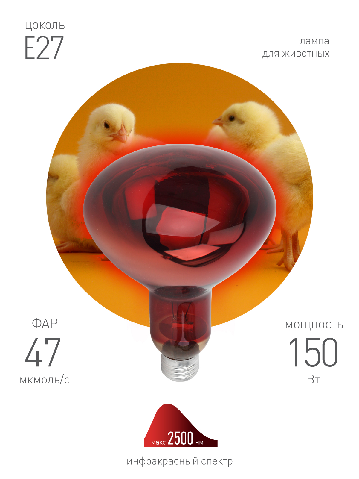 Инфракрасная лампа ЭРА ИКЗК 230-150 R127 для обогрева животных 150 Вт Е27 с красной колбой активно используется в животноводстве, птицеводстве и растениеводстве. Максимальная тепловая мощность без яркого света. Идеальна для стабилизации теплового баланса новорождённых и молодых животных. 100% энергии переходит в тепловую. Работа лампы не зависит от скачков сети, микроимпульсов. Не требуются стабилизаторы напряжения, лампа работает даже при пониженном напряжении. Мгновенно включается и нагревается. Минимум пульсаций освещения. Компактные размеры.Внимание: лампа используется только с керамическими цоколями (не с пластиковыми). Инфракрасные лампы ИКЗ 220-250 R127 E27, ИКЗК 220-250 R127, ИКЗК 230-100 R95 E27, ИКЗК 230-150 R127, ИКЗК 230-60 R63 Е27 не предназначены для использования в системах диммирования. При использовании с диммером ресурс работы лампы резко снижается, что может привести к нежелательным последствиям.