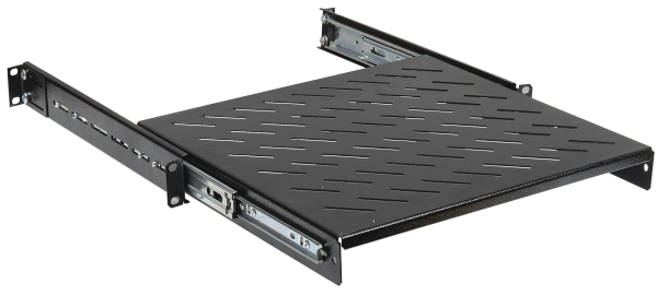 Выдвижные полки крепятся на фронтальные и на задние профили, имеют перфорированную поверхность для обеспечения лучшего охлаждения и отведения теплых воздушных потоков, а за счёт наличия специальных телескопических салазок способны плавно выдвигаться вперед за пределы рабочей плоскости, образованной передней парой 19'' профилей. Данные полки рассчитаны на оборудование, требующее регулярного обслуживания и извлечения из шкафа, но с небольшой общей массой, чтобы избежать его опрокидывание и возможной поломки выдвижного механизма полки.