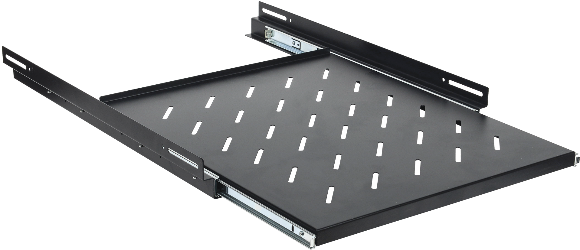Выдвижные полки крепятся на фронтальные и на задние профили, имеют перфорированную поверхность для обеспечения лучшего охлаждения и отведения теплых воздушных потоков, а за счёт наличия специальных телескопических салазок способны плавно выдвигаться вперед за пределы рабочей плоскости, образованной передней парой 19'' профилей. Данные полки рассчитаны на оборудование, требующее регулярного обслуживания и извлечения из шкафа, но с небольшой общей массой, чтобы избежать его опрокидывание и возможной поломки выдвижного механизма полки.