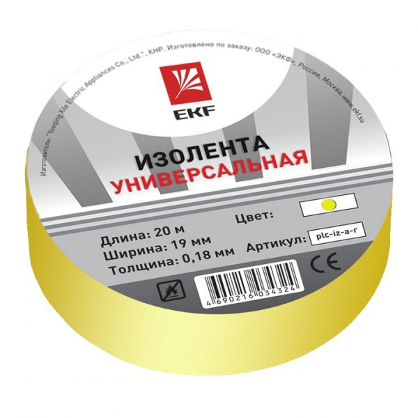 Изолента EKF изготавливается из высококачественного негорючего ПВХ. Представляет собой расходный материал для проведения бытовых и строительных электромонтажных работ. Используется для электроизоляции, в целях маркировки, а также для защиты от механических повреждений, воздействия влаги и др. Устойчива к воздействию УФ-лучей, влажности, истиранию, коррозии металлов, старению. Клеевой слой на резиновой основе. Изолента выпускается в рулонах по 20 м двух типов: профессиональная (класс А) и общего применения (класс В). Семь вариантов цвета: белый, красный, синий, желтый, зеленый, черный, желто-зеленый.