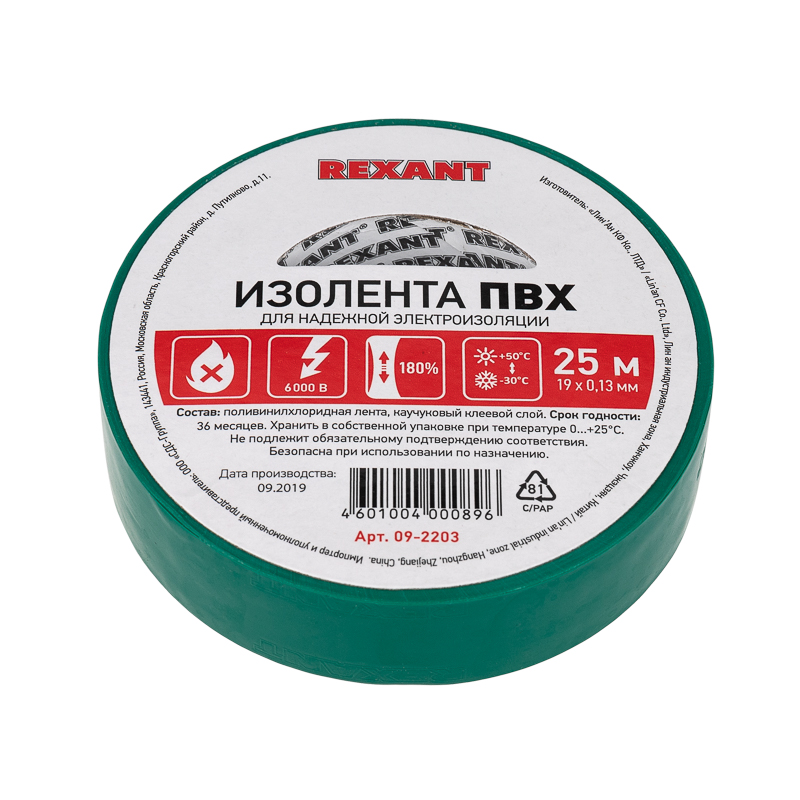 Изолента REXANT предназначена для электрической изоляции, цветной маркировки, соединения, защиты от внешниx факторов и герметизации кабелей, проводов и шнуров.Состав: Лента ПВХ, клеевой слой.