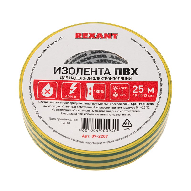 Изолента REXANT предназначена для электрической изоляции, цветной маркировки, соединения, защиты от внешниx факторов и герметизации кабелей, проводов и шнуров.Состав: Лента ПВХ, клеевой слой.