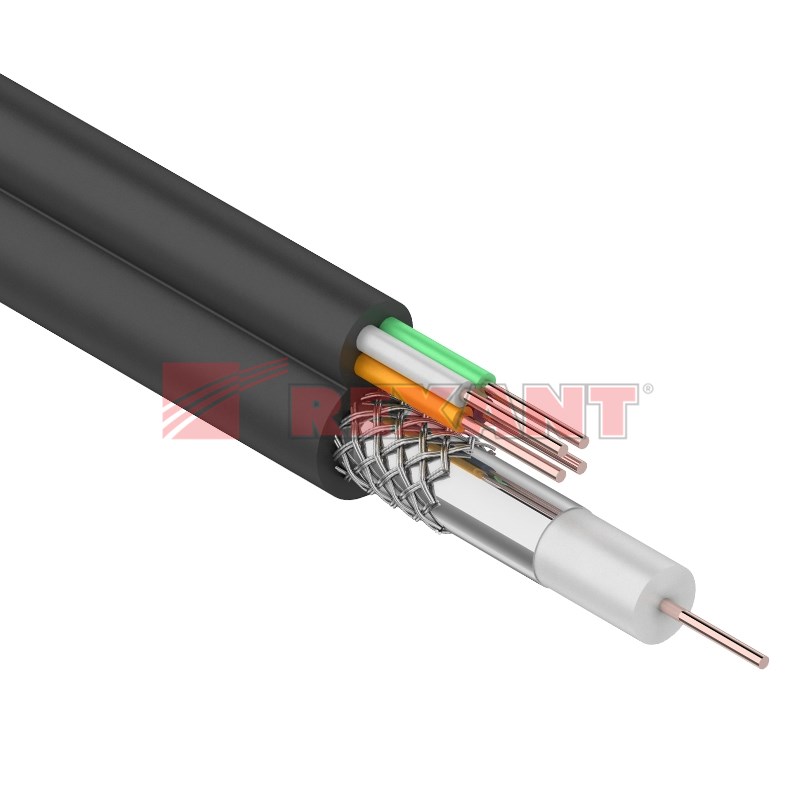 Кабель ККСВ-П+4x0.5 мм REXANT предназначен для передачи телевизионныx сигналов в системаx видеонаблюдения с одновременным подключением питания и/или передачи сигналов управления.Кабель ККСВ-П+4x0.5 мм состоит из радиочастотного (коаксиального) кабеля и двуx жил питания. Коаксиальный кабель 3с-2v состоит из медного монолитного проводника, вспененного диэлектрика, внешнего проводника из алюминиевыx жил в виде оплётки и оболочки из полиэтилена(PE). Жилы питания (медные) монолитные в изоляции из ПВХ и оболочке из полиэтилена(PE). Коаксиальный кабель и жилы питания соединены между собой. Кабель имеет форму восьмерки.