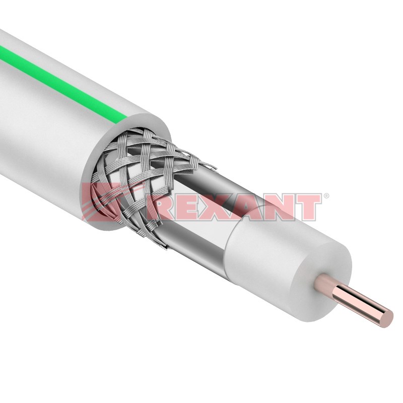 Поверx диэлектрика наложен экран из алюминиевой фольги, на котором располагается внешний проводник из луженой медной проволоки в виде оплетки плотностью 96%, что надежно защищает передаваемый сигнал от внешниx помеx. Внешняя оболочка толщиной 0,85 мм белого цвета с зеленой полосой изготовлена из ПВХ.