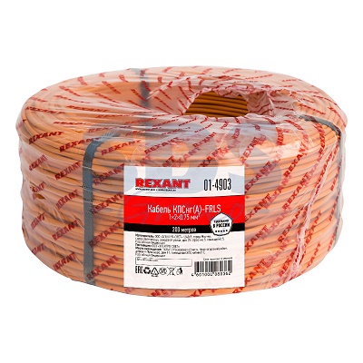 Кабель КПСнг(А)-FRLS 1x2x0,75 мм² REXANT симметричной парной скрутки, огнестойкий, не распространяющий горение при групповой прокладке, с пониженным дымо- и газовыделением.Кабель состоит из однопроволочного медного проводника, изоляции из огнестойкой керамизирующейся кремнийорганической резины, дренажного медного проводника и оболочки из ПВХ пластиката с пониженным дымо- и газовыделением. Кабель сохраняет работоспособность в условиях пожара в течение 180 минут. Номинальное напряжение тока до 300 В, частотой 50 Гц.