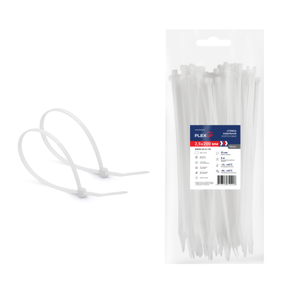 Изделия упакованы в герметичные пакеты многоразового использования с замком Zip-Lock. Этот тип упаковки обеспечивает удобное xранение и защиту от пыли, а также предотвращает потерю влаги. Стяжки упакованы в наборы по 100 штук.