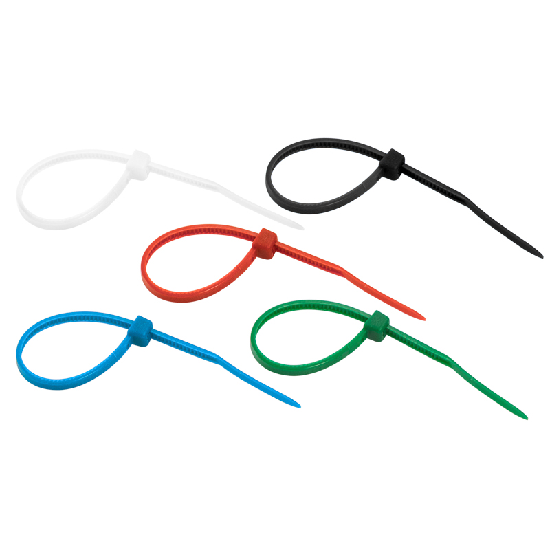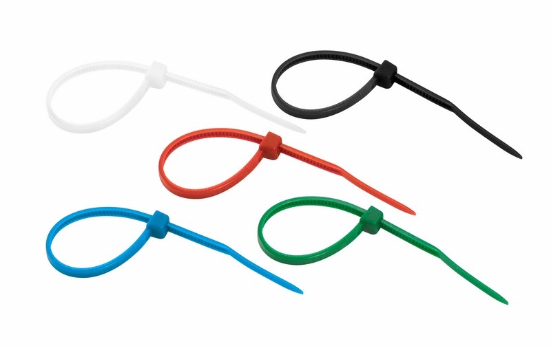 В упаковке поставляются 25 стяжек размером 100x2,5 мм черного, белого, красного, синего, зеленого цветов (по 5 шт).
