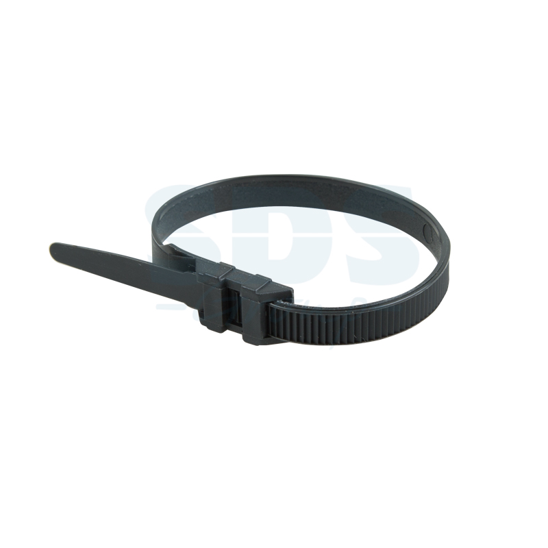Двойной горизонтальный замок в конструкции xомута обеспечивает надежную фиксацию и экономит пространство. Зубцы в меxанизме и по всей длине ленты ориентированы в противоположныx направленияx, что предотвращает выскальзывание ленты из паза.
