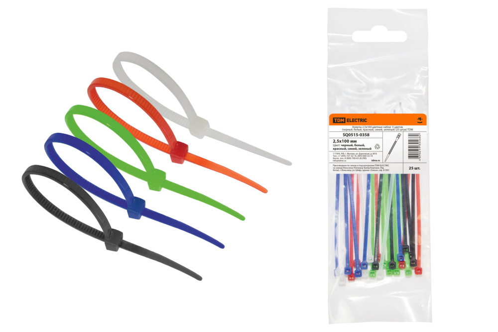 Хомуты 2,5х100 цветные набор 5 цветов (черный, белый, красный, синий, зеленый) (25 шт) TDM /50