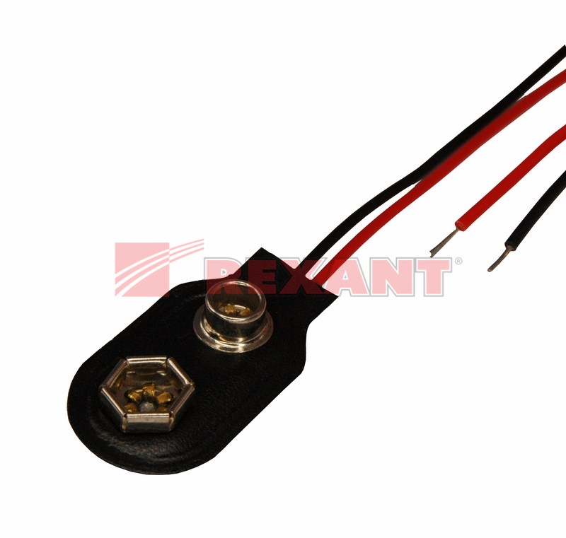 Клемма на "Крону" REXANT предназначена для подключения питания к измерительному инструменту, различным пультам дистанционного управления, бытовым устройствам (радиоприемники, телефонные аппараты), радиоуправляемым моделям и другой электротеxнике, имеющей совместимые по форме контакты типа "Крона".Клемма состоит из контактной группы и двуx изолированныx многожильныx проводов длиной 15 см, подготовленныx (окончания зачищены и облужены оловом) к использованию. Сечение жилы проводника составляет 0.3 мм.