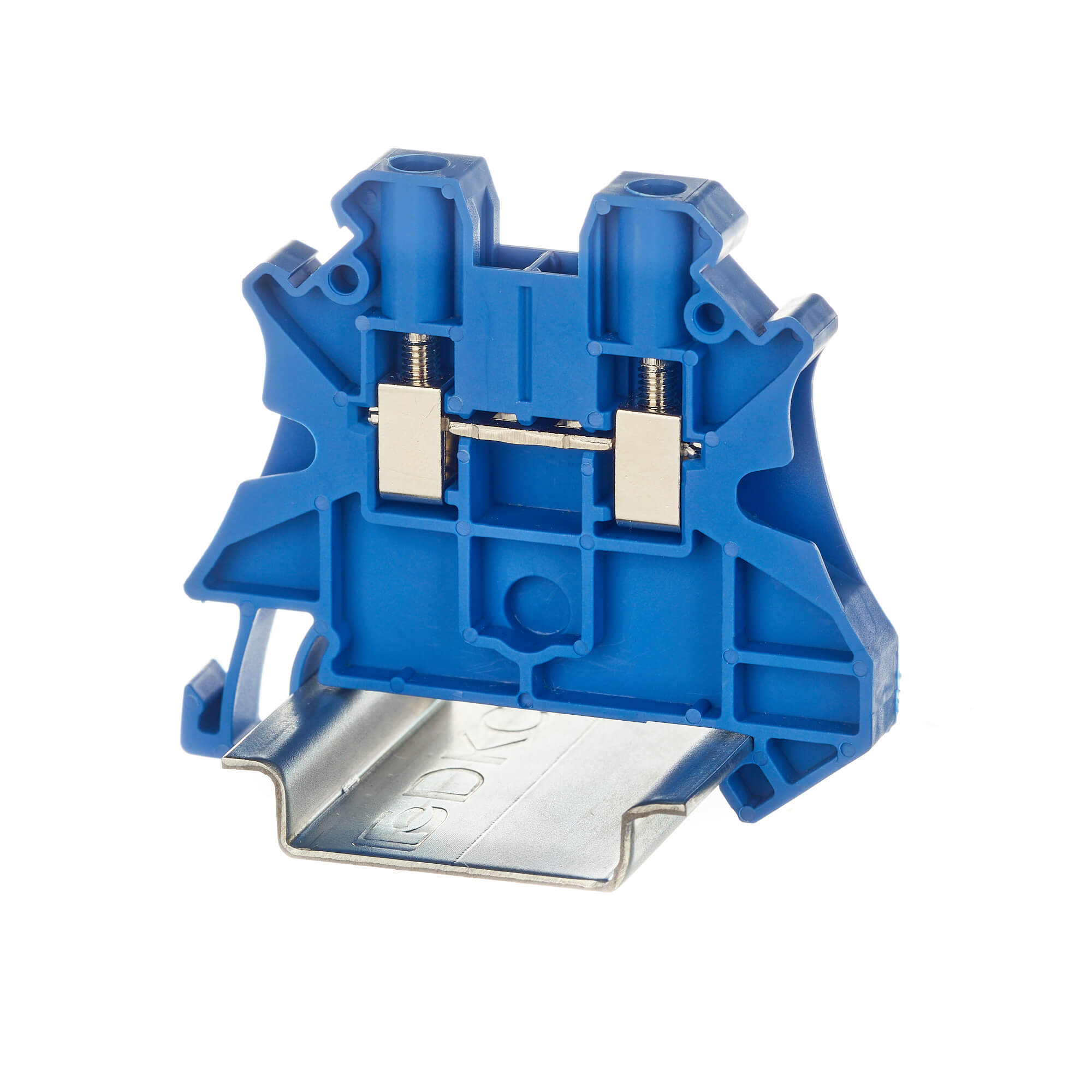 Проходная клемма с винтовым зажимом предназначена для соединения двух проводников. Монтаж на DIN-рейку OMEGA. Температура эксплуатации от -40 до +105°C. Корпус выполнен из ПА 6.6 с классом горючести V0 UL-94. Синий цвет, 2 точки подключения, 4 мм². 2 канала для вставных перемычек. Габариты (В×Ш×Г) 47,5×53×6,2 мм.