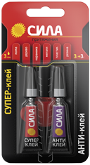 Супер-клей и Антиклей на одном блистере. Супер-клей СИЛА, идеально подходит для быстрого и эффективного ремонта различных предметов мебели, интерьера и т.д. Накрепко схватывает дерево, резину, фарфор и пластик, при этом супер клеи экономично расходуются и высыхают за несколько секунд. Антиклей предназначен для удаления как свеженанесённого, так и затвердевшего моментального клея с большинства материалов. С помощью антиклея можно также обезжирить или очистить загрязнённые поверхности перед склеиванием.