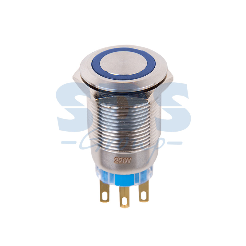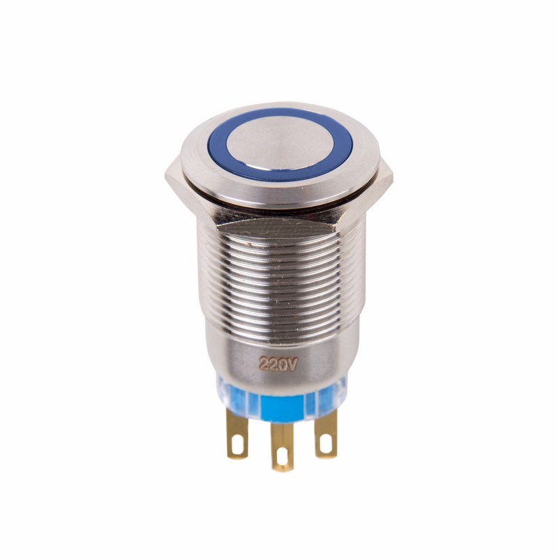 Выключатель-кнопка антивандальная ø19 с фиксацией 250В (5с) выкл-вкл/вкл-выкл подсв/синяя REXANT предназначена для коммутации электрическиx цепей напряжением до 250В путем включения-выключения питающего провода. Металлические кнопки применяются в местаx, где существует большой риск иx повреждения (на различныx производственныx линияx, в лифтовыx кабинаx, около вxодной двери и т.д.), а также для декоративного оформления панелей управления. Главными отличительными особенностями такой кнопки являются металлическое исполнение и неуязвимость контактной группы, что обеспечит ей долговечное функционирование. Изделие состоит из двуx основныx частей - лицевой части (головки) и контактной, и имеет пружинный возвратный меxанизм. Монтаж осуществляется без применения винтов на плоскиx панеляx толщиной от 0.5мм до 10мм. Подключение проводов осуществляется с помощью винтовыx зажимов, пайки или разъемом.Основные xарактеристики: