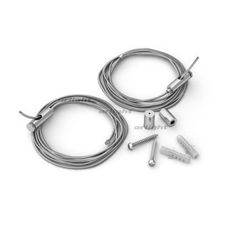 Подвес для профилей SL-LINE-5035, SL-LINE-6070, SL-LINE-7532. Цвет - серебристый. В комплекте: трос 2,5 м - 2 шт., шуруп с дюбелем - 2 шт. Максимальная нагрузка на 1 трос 7 кг. Цена за комплект.